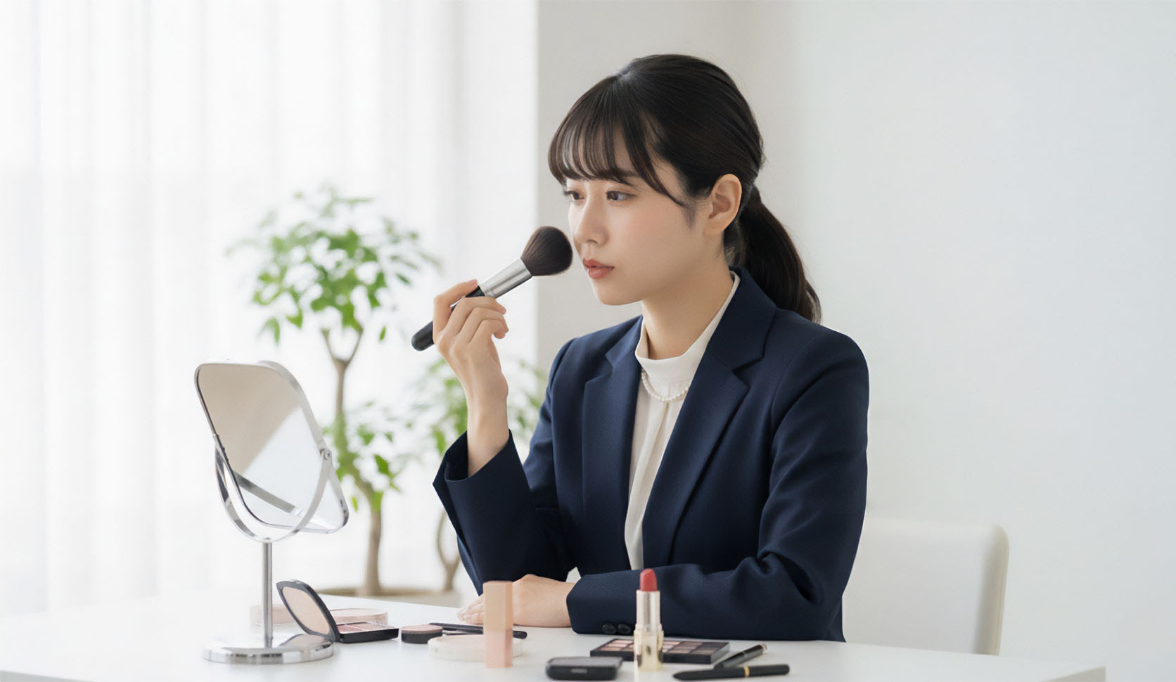 眉をきちんと描くと、顔全体が引き締まり、意志の強い印象になります。また、アイラインをまつ毛の際に細く引くだけで、目元がはっきりします。画面越しでも、あなたの表情がイキイキと伝わりやすくなります。 - 照明