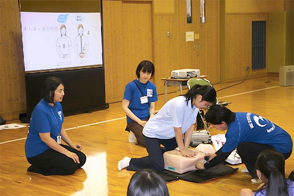 AEDのサポートに参加した4年生の学生からは、「自分が発したアドバイスで、“胸骨圧迫のコツがつかめた気がする!”という声が聞けて、嬉しかったです」、「こんなに大人数の演習に参加できる機会はめったにないのでいい経験になりました」、「どのように声掛けをすれば、スムーズな進行やグループ全員の参加を促せるかを考える機会になりました!」といった声が聞かれました。
