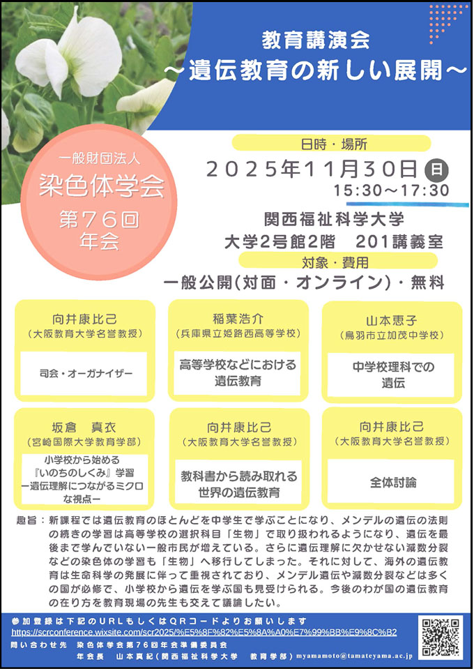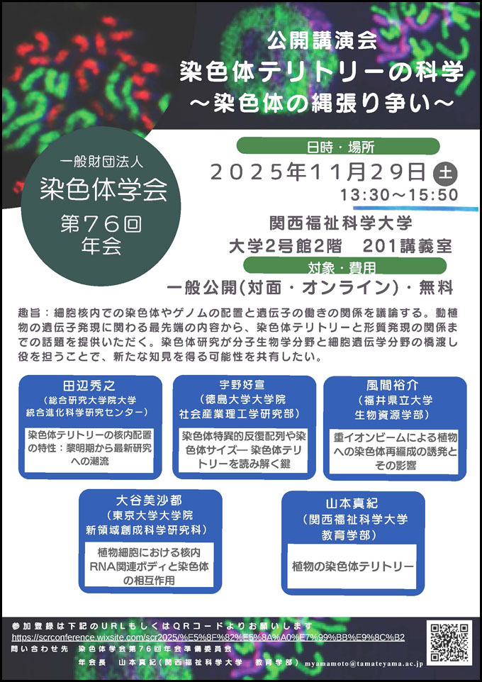 11月29日(土)30日(日)に本学において染色体学会の年会が開催されます。