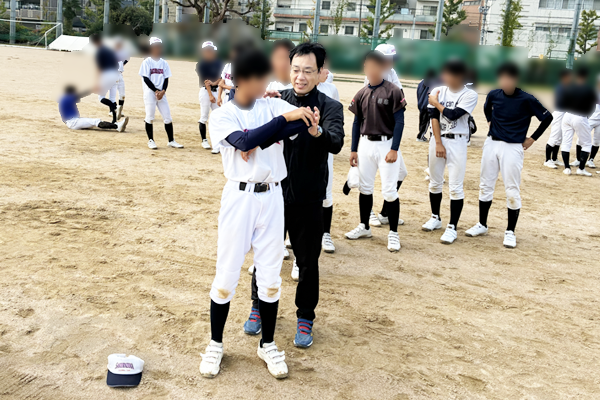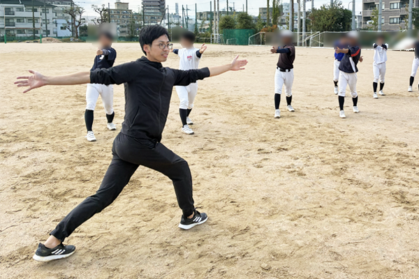 当日は本学、リハビリテーション学科の三谷教授(理学療法士)と植田助教(理学療法士)による、野球選手の障害予防と、日常のケアや故障予防に有効なトレーニングについて実際に体を動かしての実技について学びました。