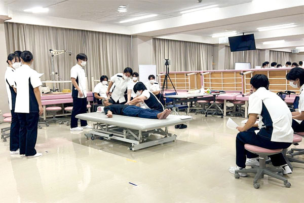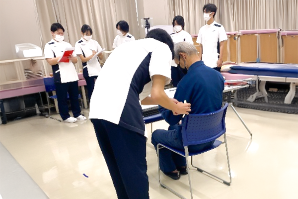 理学療法学専攻では、「学びを実践に」を目指し3年生の理学療法臨床学演習Ⅱにおいて体験を通じた教育を行っています。この授業では実際の患者様に協力いただき「理学療法のプロセス(評価から治療プログラム立案まで)」を学んでいます。学生にとっては臨床で求められる知識や技術、思考力をリアルに感じることができる機会となっています。