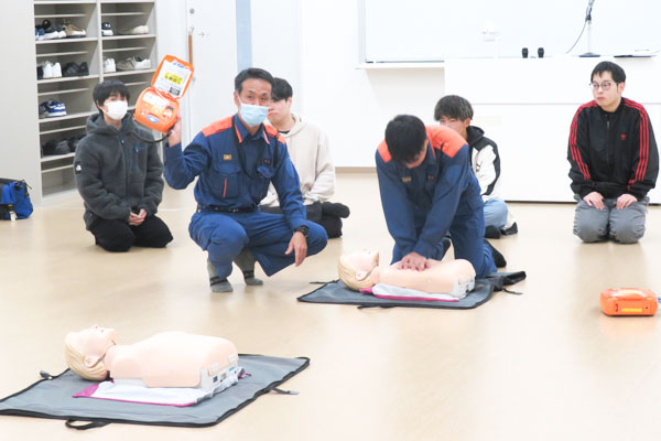 講習では心肺蘇生に関するDVDを視聴した後、訓練用人形やAEDトレーナーを使った実技を行いました。消防隊の方から胸骨圧迫やAED操作のポイントについて教えてもらい、学生は熱心に練習していました。