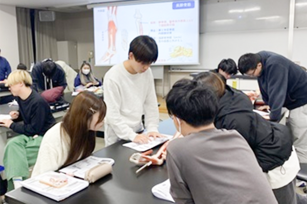 理学療法学専攻および作業療法学専攻の1年生は、解剖学の授業を通じて、人の身体を立体的に理解する学びを進めています。授業では、筋肉の模型を観察しながら、その構造や働きを確認。教科書だけでは得られないリアルな知識を身につけることができます。