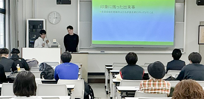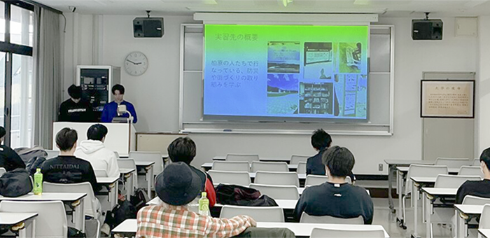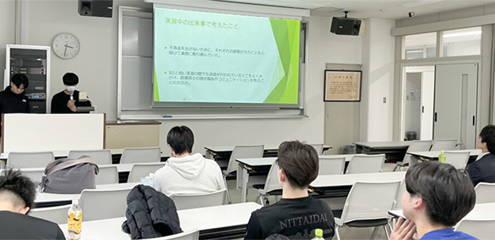 学生たちは、実習先(タントまちづくり事業部、暮らしづくりネットワーク北芝、ディーセント・ファームかしわら、國陽電興株式会社)ごとに作成したスライドを用いて実習プログラムの紹介と成果報告を行い、緊張しながらも自らの学びを共有しました。