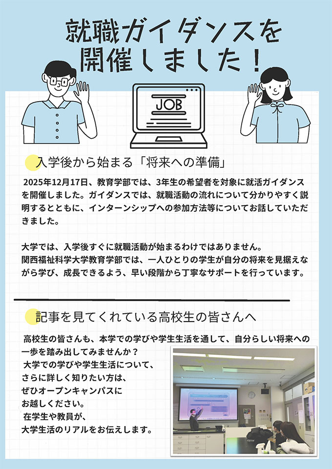 関西福祉科学大学 HOME > 新着情報 > 2025年 新着情報 > 【教育学科】就職ガイダンスを開催しました!