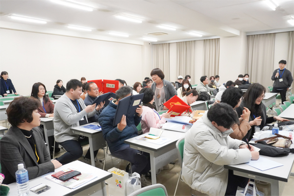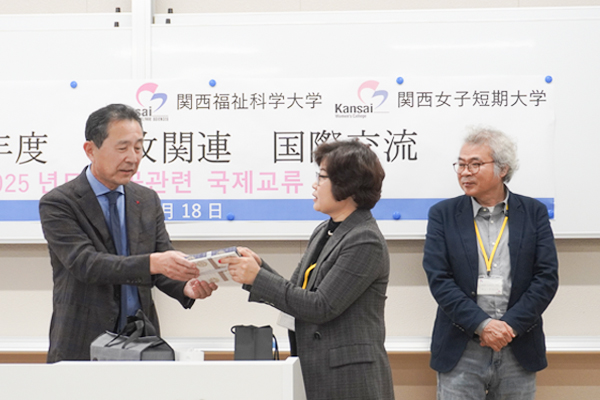 令和7年12月18日(木)「韓国 春海保健大学」学生11名・教員2名が関西福祉科学大学・関西女子短期大学を訪問されました。春海保健大学と本学は、2年前の令和5年12月に学術協定を締結しています。まず、江端理事長・学園長からの歓迎挨拶、ソ・ファジョン教授からの訪問挨拶がございました。その後、福祉創造学科の授業を見学し、活発に質問されていました。また、実際に介護用着物を体験し感嘆の声が上がるなど、短いながらも有意義な時間となりました。最後に、本学学生と春海保健大学の学生との学生間交流を実施いたしました。本学からは約15名の学生が参加し、互いに言語の壁を越えコミュニケーションを取り、盛り上がる様子が見られました。最後は写真撮影をするなど、名残惜しい雰囲気の中、終了いたしました。