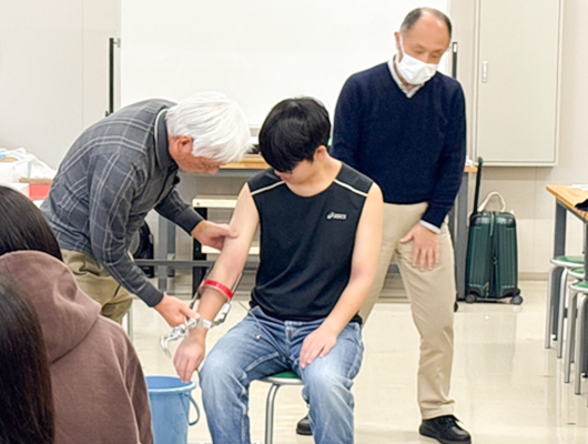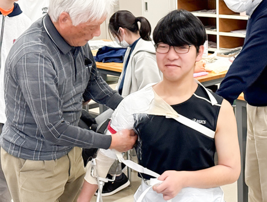 作業療法学専攻2年生の「義肢装具学」で、上肢切断後の生活を支える訓練用仮義手を製作しました。今回は、本学リハビリテーション学科名誉教授の谷合先生にご講義いただき、仮義手を「作る・合わせる・使う」体験を通して、授業で学ぶ知識を臨床での支援の視点へつなげました。