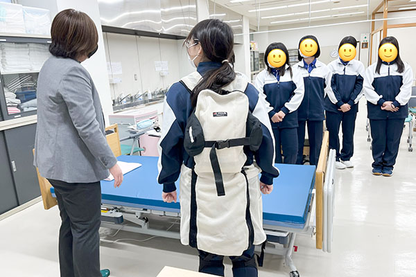 生活支援技術(基礎)の授業で介護ロボットの体験をしました。体験したのは、福祉創造学科が所有するロボットアシストウォーカーと、株式会社ジェイテクトが開発したパワーアシストスーツ(J-PAS fleairy:ジェイパスフレアリー)です。