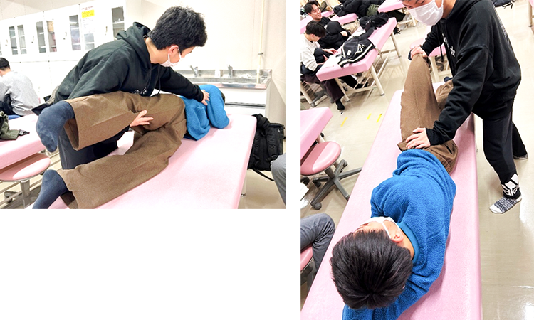理学療法士として現場で求められるのは、知識だけでなく、実際に患者様の手足を適切に動かせる確かな技能です。学生達はペアやグループで協力しながら、工夫を重ねて技術の修得に励んでいます。