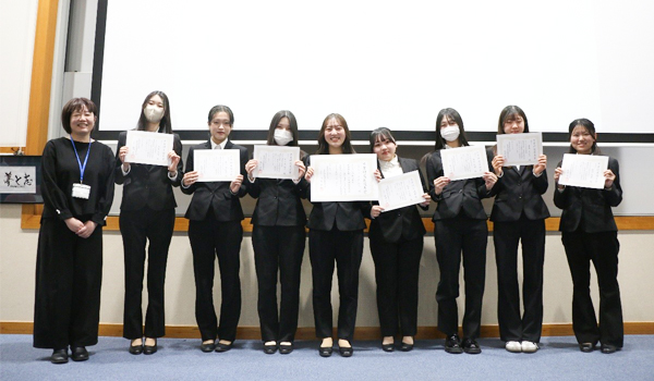 卒業研究による成果を8つのゼミの代表者が発表しました。卒業研究は4年間の学びの集大成といえ、身近な健康に関する疑問や養護教諭の仕事に役立つテーマを選んで研究を行っていました。